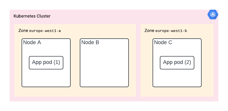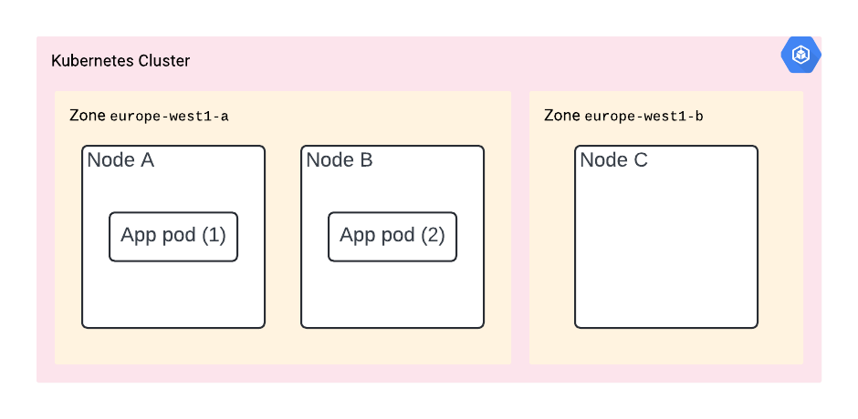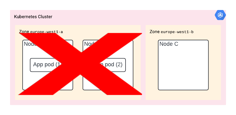 You deployed your app with pod anti-affinity and it’s now deployed on nodes A and B. However, it turns out they are both in the same zone.