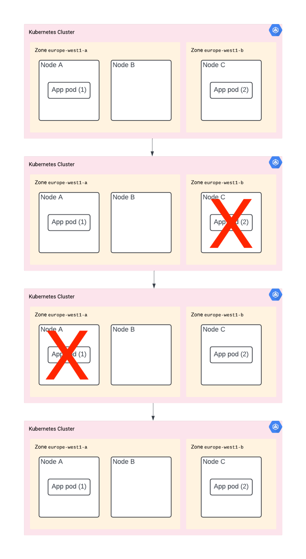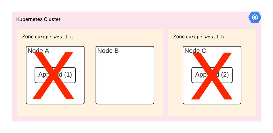 You did all of the above. However, now the K8s control plane is doing node upgrades. And – you guessed it – node A and C are going to be upgraded at the same time. In other words, your app is going to be down. Again, no luck.