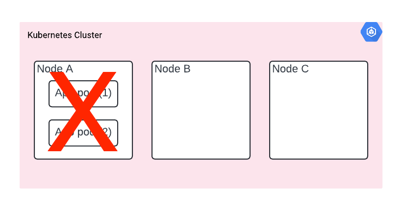 Then node A goes down for any reason. If we’re lucky and it’s planned, our app is going to receive SIGTERM and K8s will start spinning it up on a second node. Maybe we get away with no downtime.